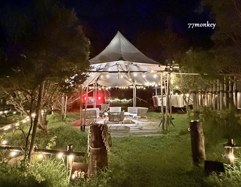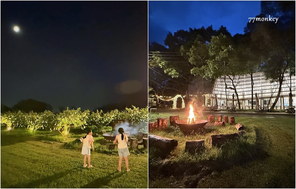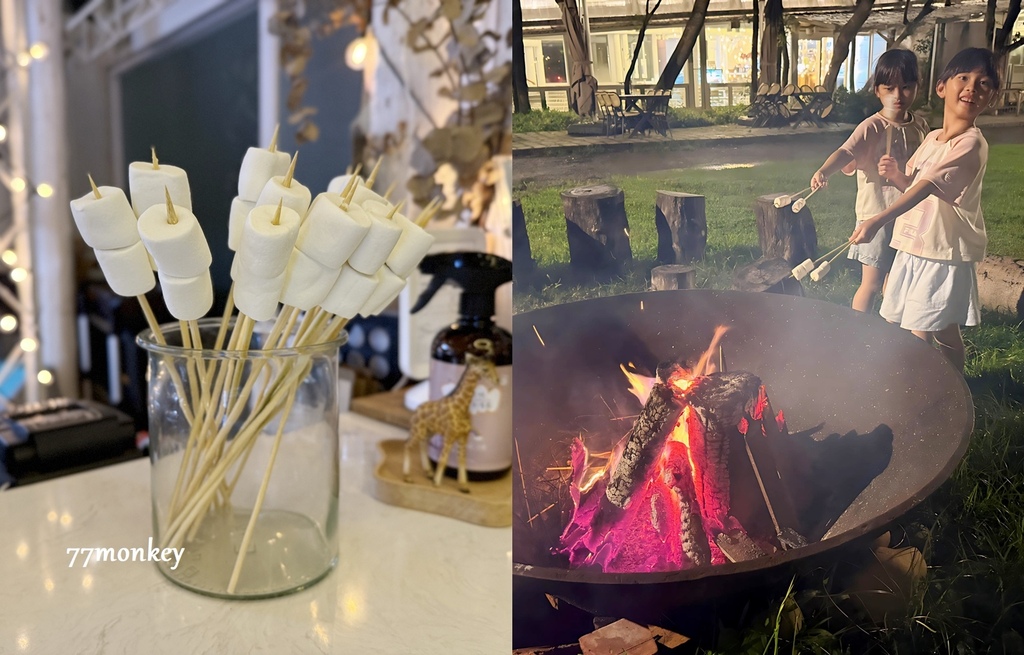 晚上草皮區會升起篝火,在篝火旁烤棉花糖,很有野營的氣氛。
