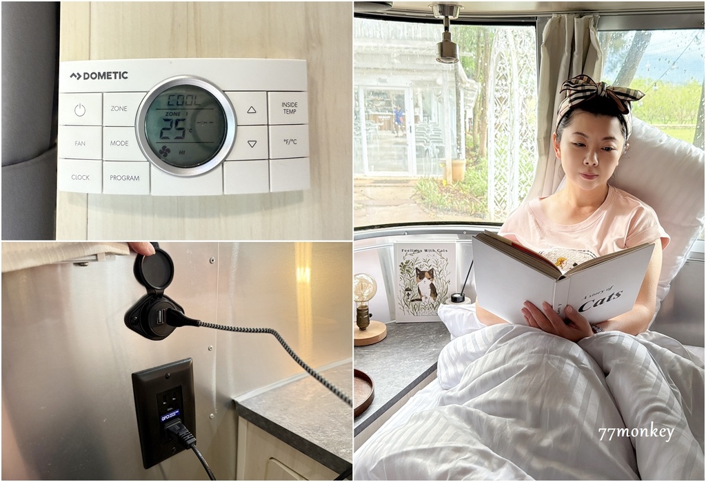 我們入住的 Airstream 28呎 Flying Cloud 拖車,車內配備原裝進口空調,降溫效果相當好,不過半夜時風聲會比較明顯,因此房內備有耳塞提供旅客使用。