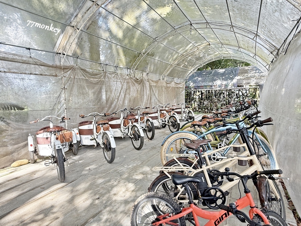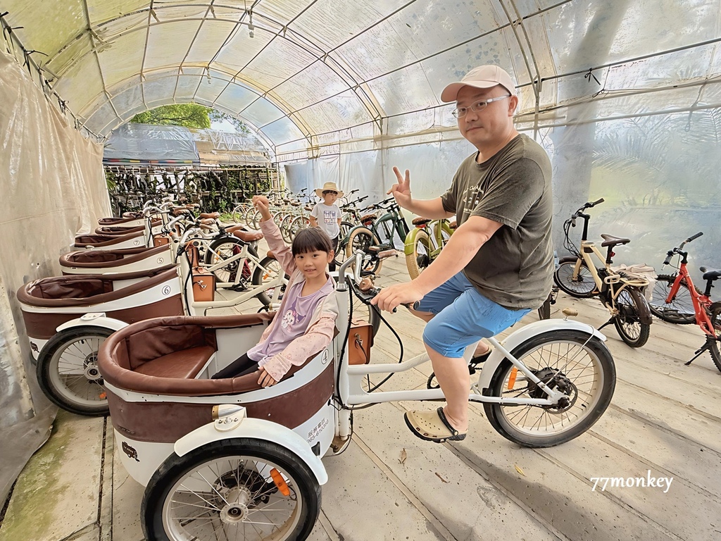園區裡可免費租借腳踏車;另外還有非常特別的西班牙親子電動腳踏車,可免費騎乘30分鐘。